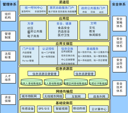 智慧民生总体架构分为六大技术层面,两大保障体系